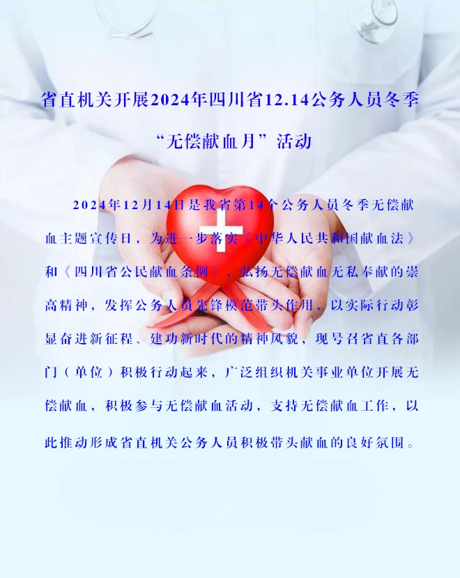 省直機(jī)關(guān)開(kāi)展2024年四川省12.14公務(wù)人員冬季 “無(wú)償獻(xiàn)血月”活動(dòng)
