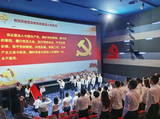 錚錚誓言,砥礪前行。巨大的電影屏幕下,飄揚(yáng)著一面鮮艷的黨旗,在廳黨委委員、政治部主任、機(jī)關(guān)黨委書記張勁領(lǐng)誓下,臺上11名新黨員分排肅立,高舉右手,莊嚴(yán)宣誓,臺下老黨員則一起重溫誓詞,慷慨激昂,豪情滿懷。此時(shí)此刻,牢記黨員身份、履行黨員義務(wù)、永葆入黨初心、不忘應(yīng)急使命,成為新老黨員共同的承諾。