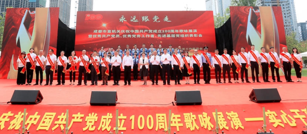 為慶祝中國(guó)共產(chǎn)黨成立100周年,激勵(lì)機(jī)關(guān)黨員干部感黨恩、聽(tīng)黨話、跟黨走,為建設(shè)踐行新發(fā)展理念的公園城市示范區(qū)凝聚機(jī)關(guān)力量,近日,由成都市直機(jī)關(guān)工委舉辦的“‘永遠(yuǎn)跟黨走’——成都市直機(jī)關(guān)慶祝中國(guó)共產(chǎn)黨成立100周年歌詠展演和優(yōu)秀共產(chǎn)黨員、優(yōu)秀黨務(wù)工作者、先進(jìn)基層黨組織表彰大會(huì)”在交子公園舉行。成都市委常委、秘書(shū)長(zhǎng)、市直機(jī)關(guān)工委書(shū)記茍正禮,市法院,省直機(jī)關(guān)工委有關(guān)領(lǐng)導(dǎo)出席活動(dòng)。市委黨史學(xué)習(xí)教育辦公室領(lǐng)導(dǎo)、市委巡回指導(dǎo)組第九組領(lǐng)導(dǎo)、市委辦公廳、市人大常委會(huì)辦公廳、參演部門(mén)領(lǐng)導(dǎo)和眉山、資陽(yáng)市直機(jī)關(guān)工委領(lǐng)導(dǎo)以及“兩優(yōu)一先”表彰對(duì)象、市直機(jī)關(guān)黨員干部代表共800人參加活動(dòng)。市直機(jī)關(guān)工委常務(wù)副書(shū)記龍蓉蓉致辭。