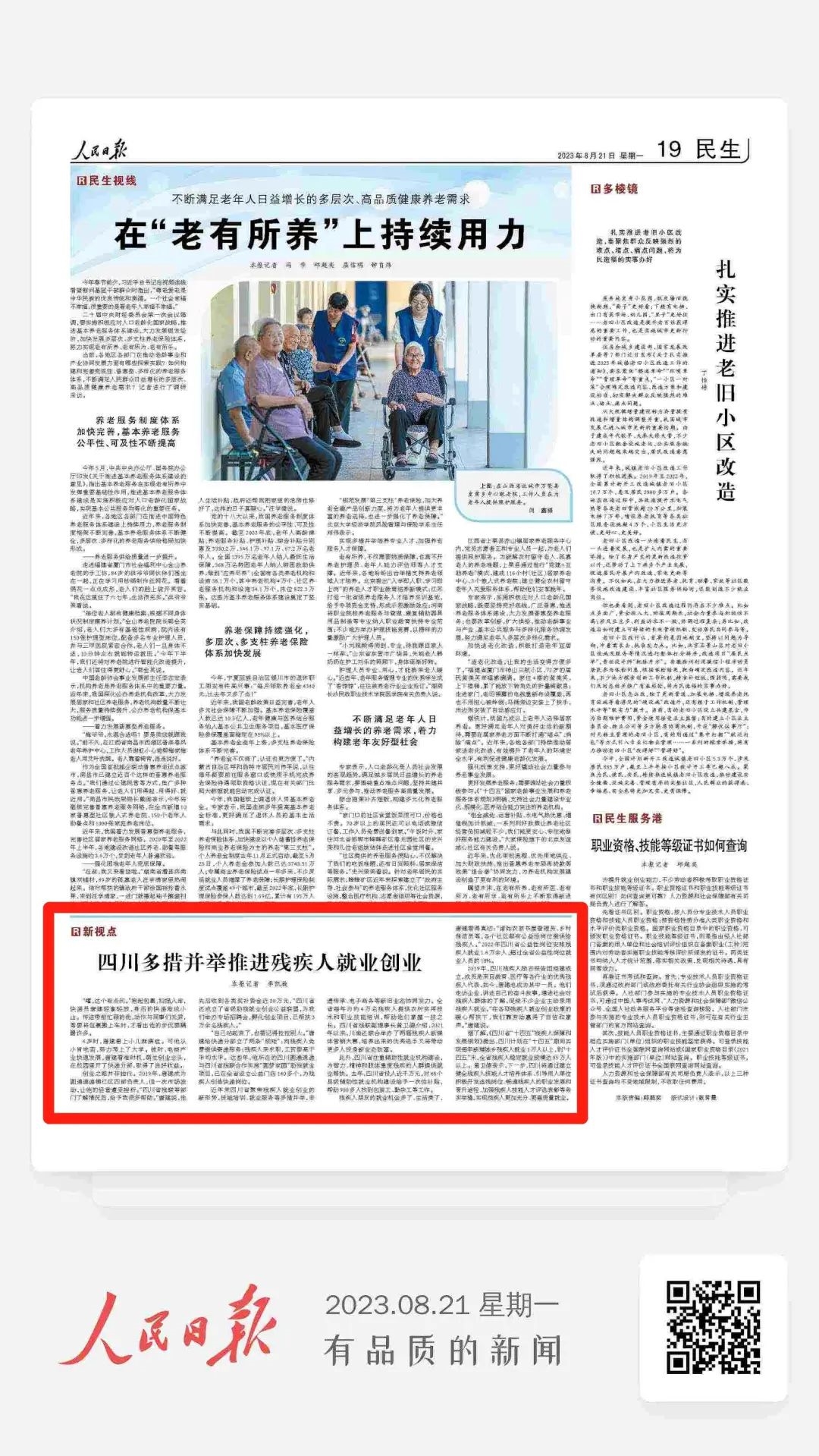 《人民日?qǐng)?bào)》刊登!今日(8月21日),《人民日?qǐng)?bào)》民生版面刊登題為《四川多措并舉推進(jìn)殘疾人就業(yè)創(chuàng)業(yè)》的新視點(diǎn)文章,聚焦我省殘疾人就業(yè)創(chuàng)業(yè)工作。
