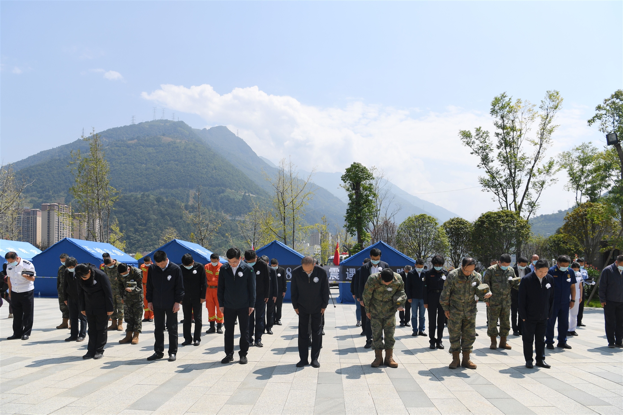 草木含悲,青山靜穆。位于震中磨西鎮(zhèn)的哀悼活動(dòng)現(xiàn)場(chǎng),懸掛著黑底白字的橫幅“深切哀悼‘9·5’瀘定6.8級(jí)地震遇難同胞”,莊重肅穆。12時(shí)50分,王曉暉、汪海江與在當(dāng)?shù)貐⑴c搶險(xiǎn)救援的各界代表,胸前佩戴白花,神情凝重,默然肅立。12時(shí)52分,“9·5”瀘定6.8級(jí)地震發(fā)生的時(shí)間,防空警報(bào)鳴響在磨西鎮(zhèn)上空,大家在肅穆的氣氛中為地震遇難同胞默哀3分鐘。默哀畢,伴隨著深情的《思念曲》,王曉暉、汪海江相繼緩步上前,向地震遇難同胞敬獻(xiàn)鮮花,表達(dá)哀思。同一時(shí)間,石棉縣哀悼活動(dòng)現(xiàn)場(chǎng),黃強(qiáng)和各界代表一起默哀并敬獻(xiàn)鮮花。國(guó)務(wù)院抗震救災(zāi)指揮部辦公室主任、中國(guó)地震局局長(zhǎng)閔宜仁,西部戰(zhàn)區(qū)副司令員兼參謀長(zhǎng)李中林,省委常委、省軍區(qū)政委田曉蔚,省委常委、秘書長(zhǎng)陳煒,副省長(zhǎng)田慶盈,武警四川總隊(duì)政委孟慶斌等依次敬獻(xiàn),表達(dá)對(duì)遇難同胞的深切哀悼。