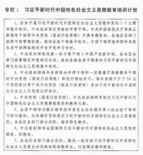 (一)聚焦聚力、久久為功。完善干部理論教育培訓(xùn)長效機(jī)制,落實黨的創(chuàng)新理論學(xué)習(xí)教育計劃,組織實施習(xí)近平新時代中國特色社會主義思想教育培訓(xùn)計劃(專欄1),系統(tǒng)謀劃、持續(xù)用力,不斷把思想鑄魂、理論武裝工作引向深入。堅持把習(xí)近平新時代中國特色社會主義思想作為黨委(黨組)理論學(xué)習(xí)中心組學(xué)習(xí)首要內(nèi)容,作出具體安排、精心組織實施;作為各級黨校(行政學(xué)院)、干部學(xué)院、社會主義學(xué)院主課必修課,辦好理論進(jìn)修班、理論研修班;作為干部學(xué)習(xí)的中心內(nèi)容,全面系統(tǒng)學(xué)、持續(xù)深入學(xué)、聯(lián)系實際學(xué)。以縣處級以上黨員領(lǐng)導(dǎo)干部為重點,開展習(xí)近平新時代中國特色社會主義思想和黨的二十大精神集中輪訓(xùn);深入開展主題教育,通過專題學(xué)習(xí)、研討交流、主題黨課、調(diào)查研究、建章立制等形式,推動黨的創(chuàng)新理論學(xué)習(xí)教育走深走實走心,使廣大干部更加深刻領(lǐng)悟“兩個確立”的決定性意義,更加自覺增強(qiáng)“四個意識”、堅定“四個自信”、做到“兩個維護(hù)”。
