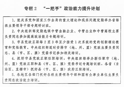 (二)突出“關(guān)鍵少數(shù)”政治訓(xùn)練。堅持把政治訓(xùn)練貫穿干部成長全周期,使干部的政治素養(yǎng)、政治能力與擔(dān)負(fù)的領(lǐng)導(dǎo)職責(zé)相匹配。強(qiáng)化“一把手”政治培訓(xùn),有計劃地選調(diào)地方、部門、國有企事業(yè)單位主要負(fù)責(zé)同志到黨校(行政學(xué)院)、干部學(xué)院參加專題培訓(xùn)。實施“一把手”政治能力提升計劃(專欄2)。省(自治區(qū)、直轄市)、市(地、州、盟)、縣(市、區(qū)、旗)黨政領(lǐng)導(dǎo)班子成員每2至3年到黨校(行政學(xué)院)、干部學(xué)院至少接受1次系統(tǒng)的黨的創(chuàng)新理論教育和黨性教育,5年內(nèi)累計不少于2個月。圍繞提高政治能力和領(lǐng)導(dǎo)能力,加強(qiáng)機(jī)關(guān)司局長、處長任職培訓(xùn)。重視對女干部、少數(shù)民族干部、黨外干部等的政治培訓(xùn)。加強(qiáng)對高層次人才的政治引領(lǐng),中央組織部會同有關(guān)單位每年組織一定數(shù)量人才開展國情研修。