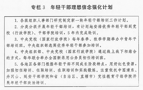 (三)加強(qiáng)年輕干部政治訓(xùn)練。強(qiáng)化習(xí)近平新時代中國特色社會主義思想學(xué)習(xí)教育,突出政治忠誠教育、理想信念教育、紀(jì)律規(guī)矩教育,加強(qiáng)優(yōu)良傳統(tǒng)作風(fēng)和責(zé)任感使命感教育,強(qiáng)化斗爭意識,綜合運(yùn)用理論講授、政策解讀、案例教學(xué)、現(xiàn)場體驗等方式開展系統(tǒng)培訓(xùn)。黨委(黨組)負(fù)責(zé)同志要講好“開班第一課”。安排思想政治素質(zhì)過硬、理論水平較高、實踐經(jīng)驗豐富的領(lǐng)導(dǎo)干部上講臺授課。探索推行“政治輔導(dǎo)員”、“導(dǎo)師幫帶”制度。通過開展黨性分析、實踐鍛煉、過“政治生日”、重溫入黨誓詞等方式,錘煉黨性修養(yǎng)、提高政治覺悟。實施年輕干部理想信念強(qiáng)化計劃(專欄3)。