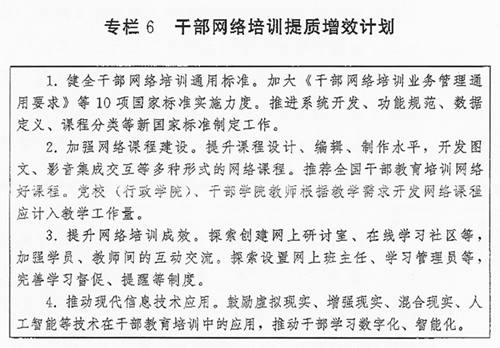 (二)加強(qiáng)網(wǎng)絡(luò)培訓(xùn)課程建設(shè)。鼓勵黨校(行政學(xué)院)、干部學(xué)院和部門、企業(yè)、高校等組織開發(fā)精品網(wǎng)絡(luò)課程。注重把握網(wǎng)絡(luò)教學(xué)特點和規(guī)律,改進(jìn)授課方式,提高制作水平,豐富呈現(xiàn)形式,提升課程質(zhì)量。嚴(yán)把網(wǎng)絡(luò)課程政治關(guān)、質(zhì)量關(guān),規(guī)范講授、制作、審核、發(fā)布和更新、退出流程。充分發(fā)揮網(wǎng)絡(luò)培訓(xùn)優(yōu)勢,推動優(yōu)質(zhì)資源下基層。用好網(wǎng)絡(luò)直播培訓(xùn)形式,增強(qiáng)現(xiàn)場體驗感。實施干部網(wǎng)絡(luò)培訓(xùn)提質(zhì)增效計劃(專欄6)。