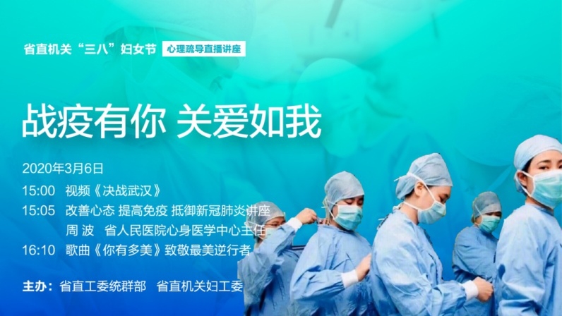 3月6日,省直機(jī)關(guān)統(tǒng)戰(zhàn)群工部、省直機(jī)關(guān)婦工委在疫情防控關(guān)鍵階段,結(jié)合疫情防控工作實(shí)際,舉辦“戰(zhàn)疫有你.關(guān)愛如我”省直機(jī)關(guān)“三八”國際婦女節(jié)心理疏導(dǎo)網(wǎng)絡(luò)直播講座,來自省直機(jī)關(guān)1600余名女性在線渡過第110個(gè)婦女節(jié)。