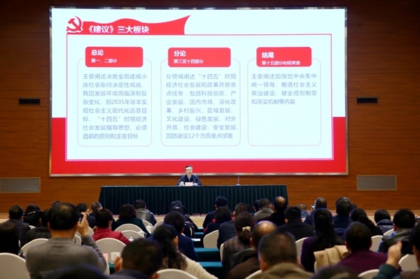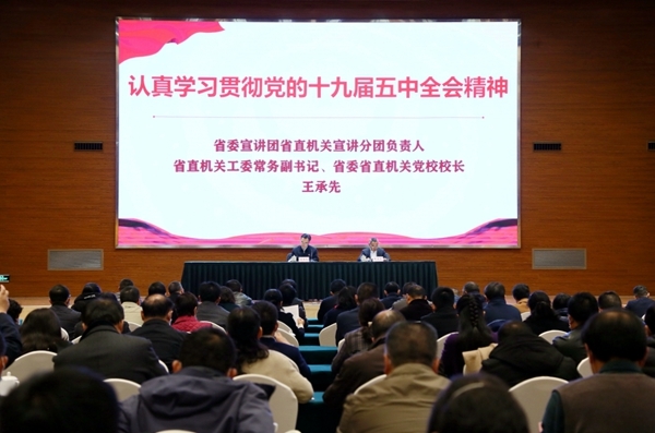 為大家?guī)磉@堂宣講報告的是省委宣講團省直機關(guān)分團負責人、省直機關(guān)工委常務(wù)副書記、省委省直機關(guān)黨校校長王承先。在2個小時時間里,他的宣講報告圍繞全面把握黨的十九屆五中全會主要精神,深刻認識《中共中央關(guān)于制定國民經(jīng)濟和社會發(fā)展第十四個五年規(guī)劃的建議》提出的重要觀點、論述和舉措,以及扎實抓好黨的十九屆五中全會精神學習貫徹等三個方面展開。