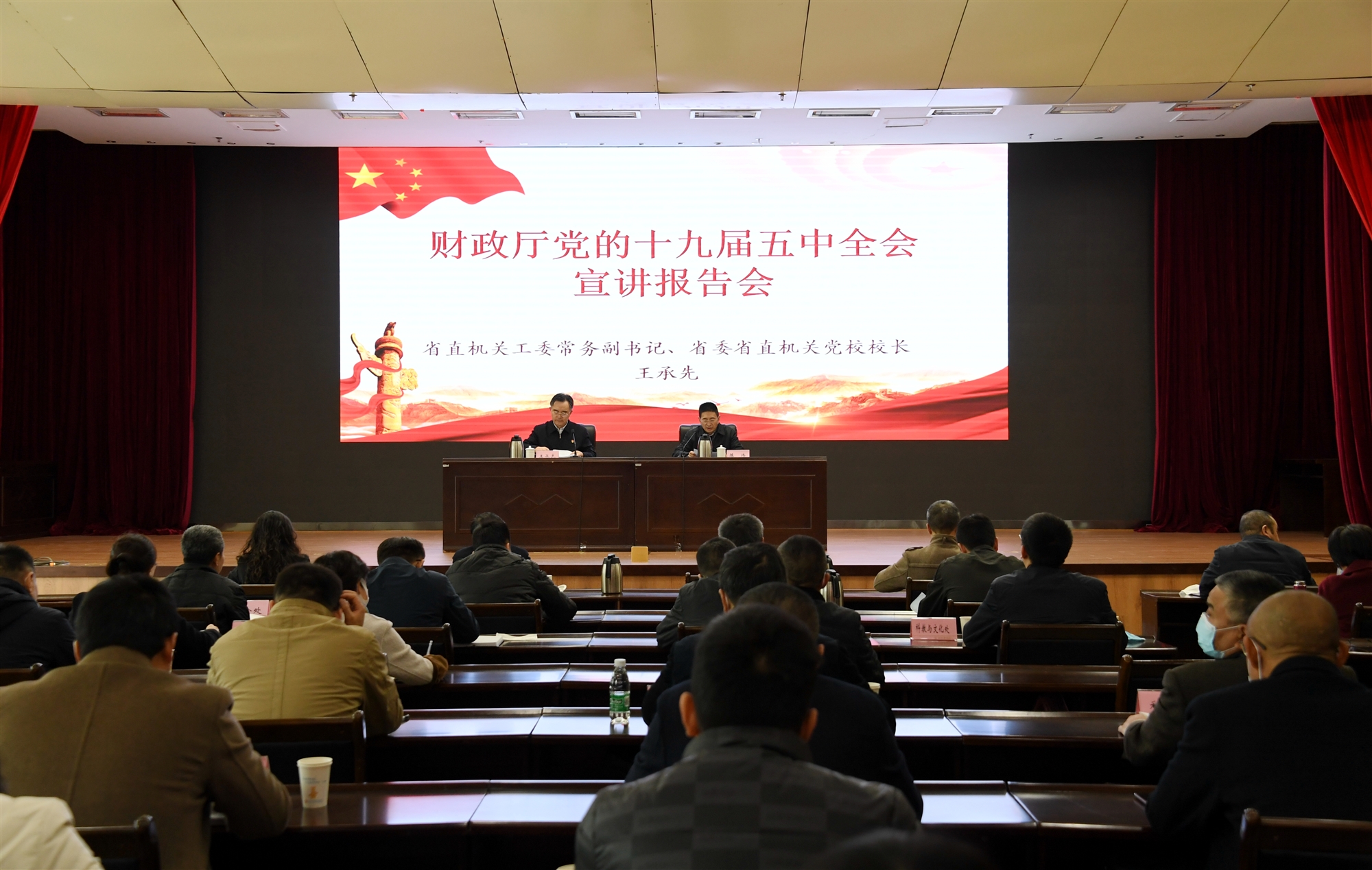 11月26日下午,學(xué)習(xí)貫徹黨的十九屆五中全會精神宣講報告會在財政廳舉行。省委宣講團(tuán)省直機(jī)關(guān)分團(tuán)負(fù)責(zé)人、省直機(jī)關(guān)工委常務(wù)副書記、省委省直機(jī)關(guān)黨校校長王承先到會作宣講報告。財政廳黨組書記、廳長陳煒主持報告會。