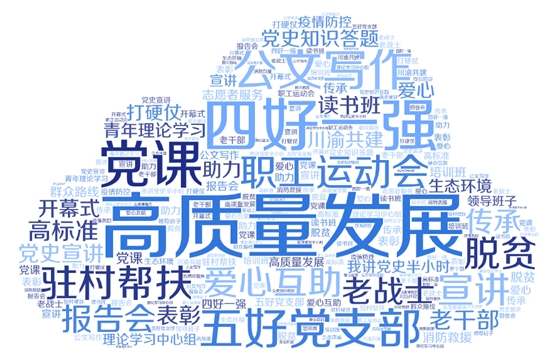 全網(wǎng)范圍內(nèi),與四川機(jī)關(guān)黨建相關(guān)的活動(dòng)、重點(diǎn)工作和稿件轉(zhuǎn)載、引用的報(bào)道情況中,熱度較高的內(nèi)容有“高質(zhì)量發(fā)展”“四好一強(qiáng)”“五好黨支部”“公文寫(xiě)作”“駐村幫扶”“愛(ài)心互助”“黨課”“職工運(yùn)動(dòng)會(huì)”“黨史知識(shí)答題”“宣講”等內(nèi)容。高頻詞最高討論次數(shù)為4844次。這些高頻詞的產(chǎn)生直觀體現(xiàn)了全省機(jī)關(guān)各級(jí)黨組織工作的積極有效開(kāi)展。