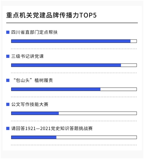 近年來(lái),四川省直各部門(mén)(單位)結(jié)合自身優(yōu)勢(shì)、特點(diǎn)以及四川地域特點(diǎn),成功打造多個(gè)能夠代表四川機(jī)關(guān)黨建形象、展現(xiàn)四川機(jī)關(guān)黨建良好風(fēng)貌的品牌活動(dòng)。2019-2021年間,通過(guò)數(shù)據(jù)分析發(fā)現(xiàn),傳播力最好的五個(gè)品牌活動(dòng)分別是“定點(diǎn)幫扶”“三級(jí)書(shū)記講黨課”“包山頭”植樹(shù)履責(zé)、公文寫(xiě)作技能大賽和“請(qǐng)回答1921—2021”黨史知識(shí)答題挑戰(zhàn)賽。