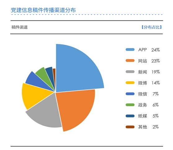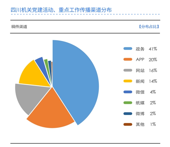 通過(guò)數(shù)據(jù)分析顯示,2021年度全網(wǎng)范圍內(nèi)四川機(jī)關(guān)黨建重點(diǎn)工作相關(guān)報(bào)道8541篇,其中在政務(wù)類APP和政務(wù)類網(wǎng)站上有關(guān)信息的傳播量最大,占總量的41%,此類渠道為主要傳播陣地;其次是新聞?lì)怉PP,占比20%。
