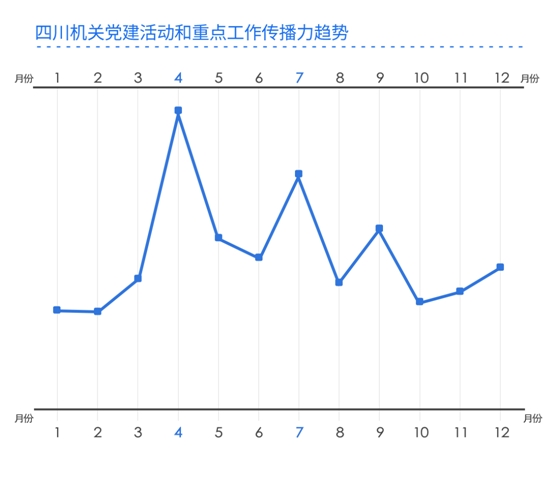 四川機(jī)關(guān)黨建活動(dòng)和重點(diǎn)工作的傳播趨勢(shì),與各級(jí)各部門(mén)開(kāi)展黨建相關(guān)工作的安排部署有關(guān)。近三年數(shù)據(jù)顯示,4月、7月、9月為四川機(jī)關(guān)黨建工作影響力波峰階段。
