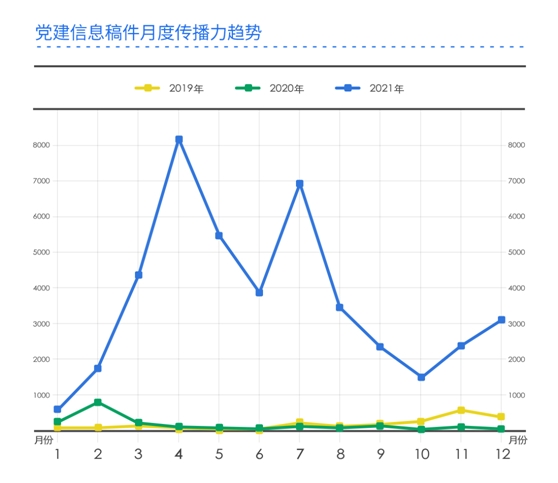 黨建信息稿件方面,2021年省直機(jī)關(guān)工委黨建相關(guān)稿件在全網(wǎng)的傳播力明顯高于2020年和2019年的傳播力。