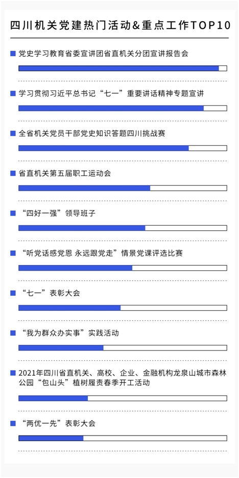 四川機(jī)關(guān)黨建被報(bào)道次數(shù)最多的10項(xiàng)活動(dòng)和重點(diǎn)工作如圖所示,與黨史學(xué)習(xí)教育、黨史知識(shí)答題、第五屆職工運(yùn)動(dòng)會(huì)、“四好一強(qiáng)”等內(nèi)容相關(guān)的傳播力大,僅“黨史學(xué)習(xí)教育省委宣講團(tuán)省直機(jī)關(guān)分團(tuán)報(bào)告會(huì)”一條的報(bào)道量就達(dá)到了3370次,相關(guān)活動(dòng)均受到社會(huì)各界廣泛好評(píng),已成為四川機(jī)關(guān)黨建和群團(tuán)工作的響亮品牌。