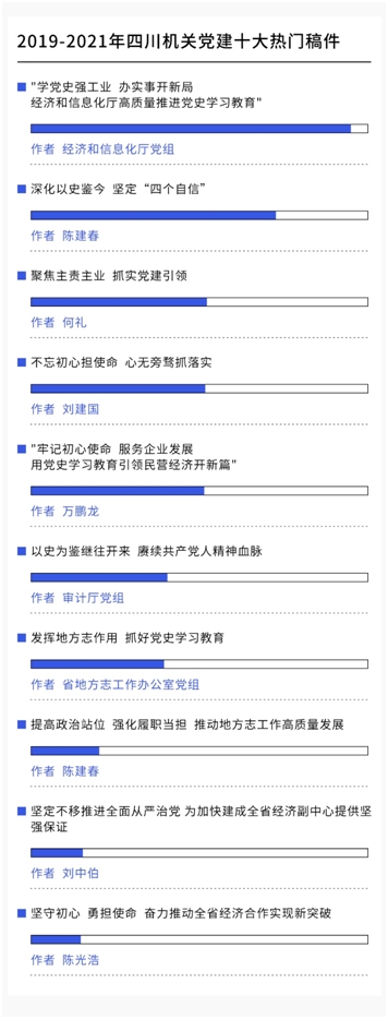 近五年來(lái),省直部門(mén)黨組(黨委)、市(州)黨委理論學(xué)習(xí)中心組主要負(fù)責(zé)同志在《四川機(jī)關(guān)黨建》發(fā)表署名文章247篇,機(jī)關(guān)基層黨支部和個(gè)人學(xué)習(xí)心得體會(huì)135篇。通過(guò)對(duì)這些文章的全網(wǎng)傳播情況數(shù)據(jù)分析,2019-2021年間,四川機(jī)關(guān)黨建發(fā)布的思想性文章被轉(zhuǎn)載、引用6萬(wàn)余次。其中,傳播量最高的10篇稿件均被轉(zhuǎn)載、引用2000次以上,經(jīng)濟(jì)和信息化廳黨組發(fā)布的《學(xué)黨史強(qiáng)工業(yè) 辦實(shí)事開(kāi)新局 經(jīng)濟(jì)和信息化廳高質(zhì)量推進(jìn)黨史學(xué)習(xí)教育》一文熱度最高,達(dá)到了13295次。