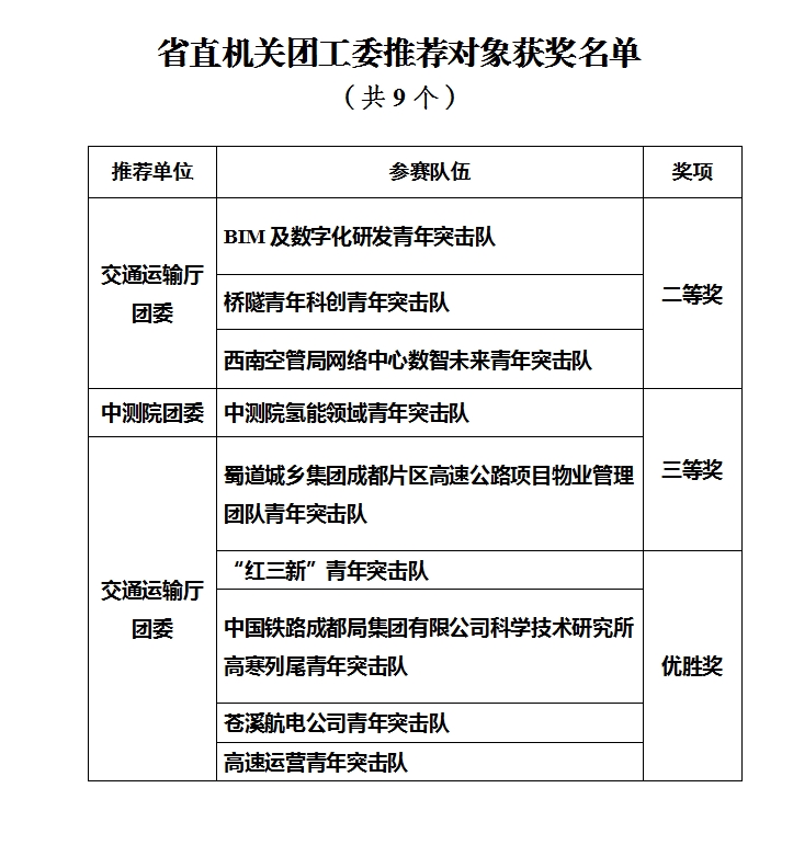 2024年,團(tuán)省委等12部門聯(lián)合舉辦四川省六大優(yōu)勢產(chǎn)業(yè)青年立功競賽活動省級競賽。本次大賽分賽創(chuàng)新、賽效率、賽質(zhì)量、賽安全、賽育人五個(gè)賽項(xiàng),來自全省的415支青年突擊隊(duì)參加,最終評選出一等獎9個(gè)、二等獎16個(gè)、三等獎37個(gè)、優(yōu)勝獎38個(gè)。其中,省直機(jī)關(guān)團(tuán)工委報(bào)送的推薦對象共獲評二等獎3個(gè)、三等獎2個(gè)、優(yōu)勝獎4個(gè)。