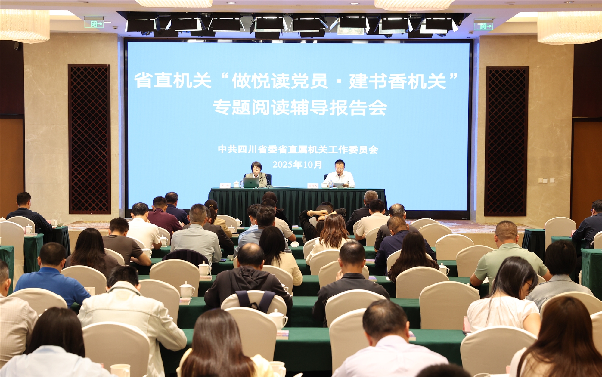 10月13日,省直機(jī)關(guān)“做悅讀黨員·建書香機(jī)關(guān)”專題閱讀輔導(dǎo)報(bào)告會(huì)在蓉舉辦,中共中央黨史和文獻(xiàn)研究院一級(jí)巡視員、研究員,中國(guó)中共黨史學(xué)會(huì)理事王旸作輔導(dǎo)報(bào)告,省委省直機(jī)關(guān)工委副書記唐功江主持報(bào)告會(huì)。省直各部門(單位)120余名黨員干部參加。