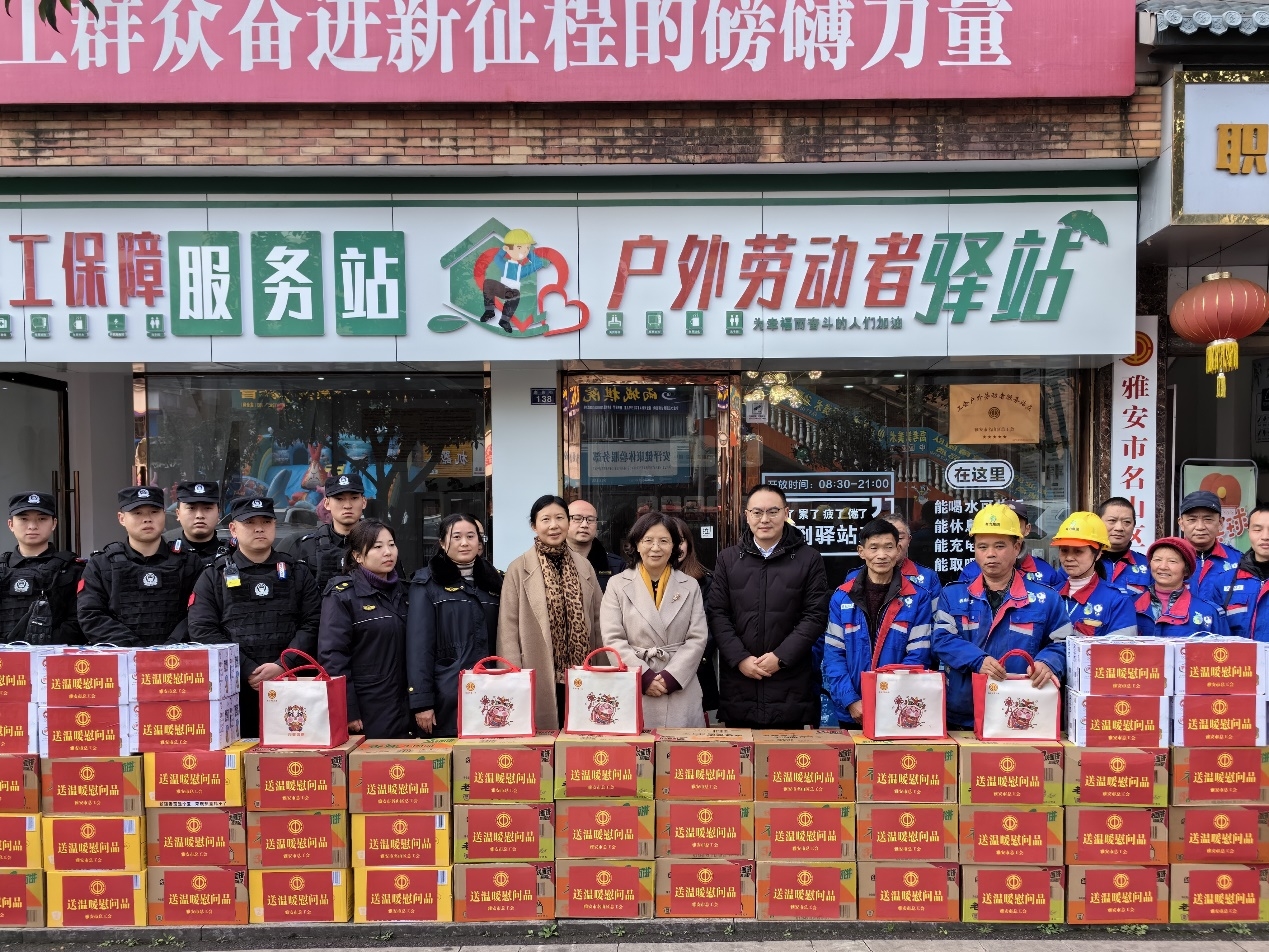 在名山區(qū)總工會戶外勞動者服務(wù)站點,慰問組對環(huán)衛(wèi)職工“寧愿一人臟、換來萬人凈”的敬業(yè)奉獻表示敬意,叮囑她們在工作中要保重身體,做好防寒保暖和安全防護。