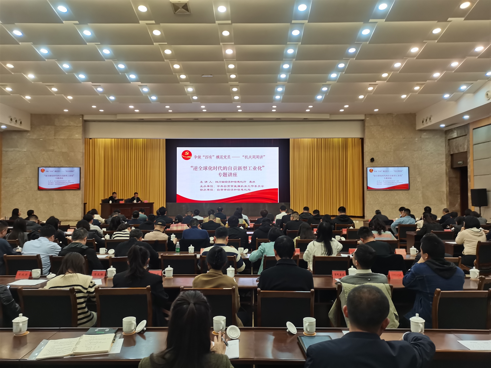 近日,自貢市直機關工委以“爭做‘四有’模范黨員”為主題舉辦“機關周周講”學習活動,邀請四川省經(jīng)濟和信息化廳總經(jīng)濟師袁冰,以“逆全球化時代的自貢新型工業(yè)化”為題作專題宣講。市直機關黨員干部代表200余人參加學習活動。