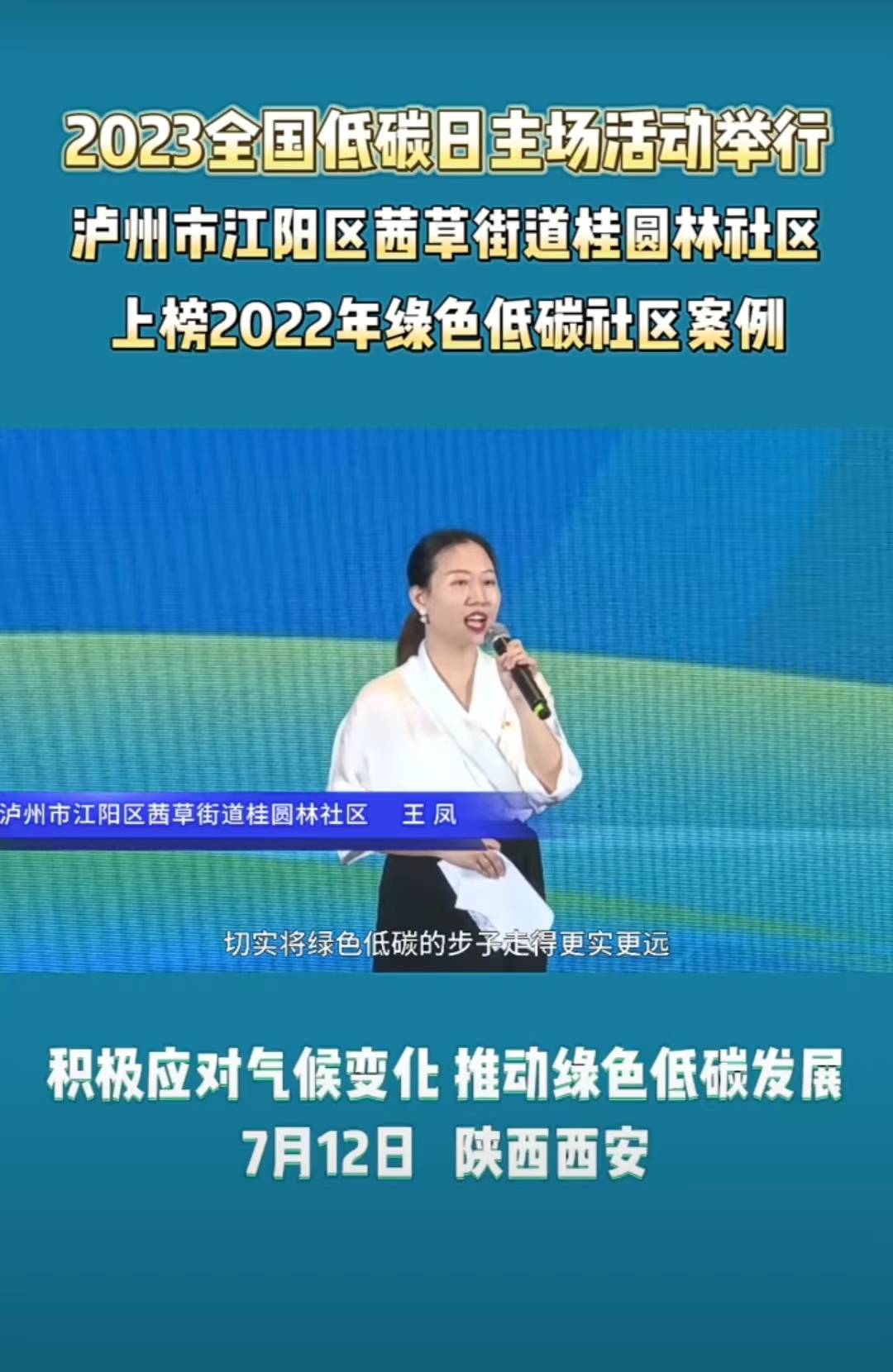 7月12日,在陜西西安舉辦的2023年“全國低碳日”主場活動(dòng)中揭曉了2022年綠色低碳典型案例征集活動(dòng)獲選名單,其中,瀘州市江陽區(qū)茜草街道桂圓林社區(qū)上榜2022年綠色低碳社區(qū)案例并現(xiàn)場交流發(fā)言。