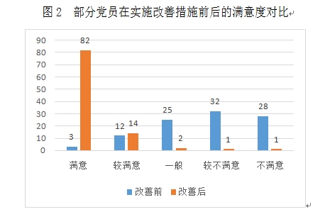 本課題組于2019年5月開始,將改善基層黨組織的工作現(xiàn)狀的措施(注重創(chuàng)新,提升黨員參與組織生活的積極性;注重支部文化建設(shè),提升支部凝聚力;告別形式主義,切實做好各項黨建工作)在5個黨支部中進行實踐,收到了較好的成效。以下是抽查了5個黨支部部分成員在實施改善措施前后的滿意度對比圖(圖2):
