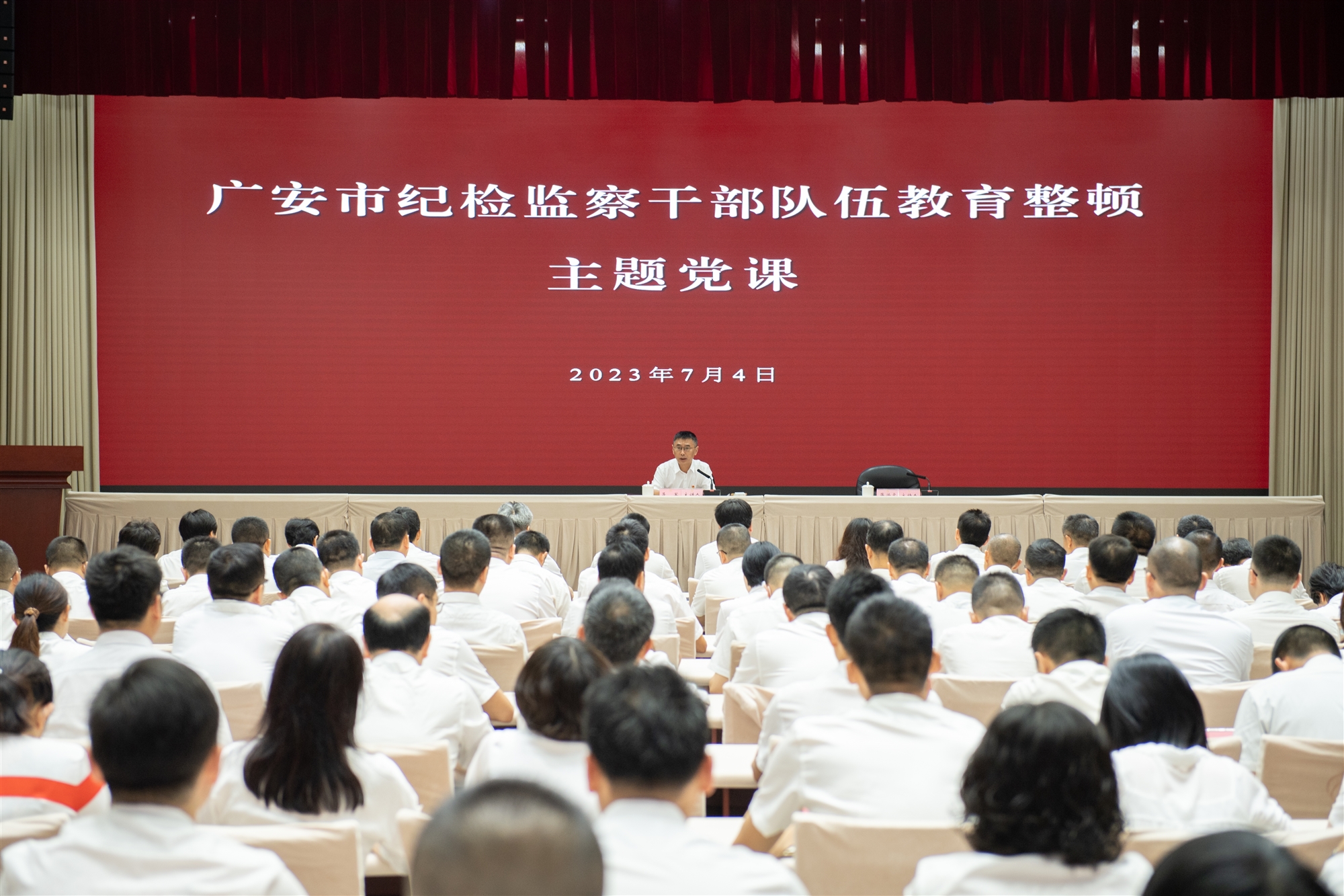 7月4日上午,廣安市紀(jì)檢監(jiān)察干部隊伍教育整頓主題黨課舉行。廣安市委常委、市紀(jì)委書記、市監(jiān)委主任聶軍以“賡續(xù)紅色血脈,傳承優(yōu)良作風(fēng),做讓黨放心、人民信賴的忠誠衛(wèi)士”為主題作黨課報告。
