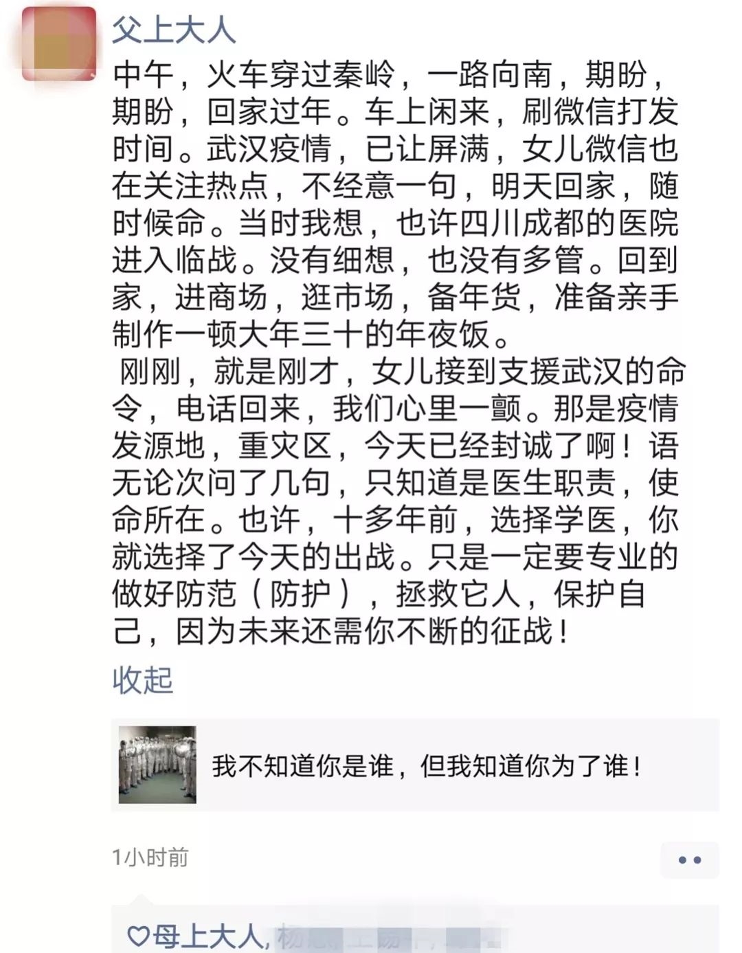 當(dāng)告知家人我的決定,爸爸在微信里告訴我:既然選擇學(xué)醫(yī)十余載,就要時刻做好出戰(zhàn)的準(zhǔn)備,這是醫(yī)生的職責(zé)所在,使命所然。