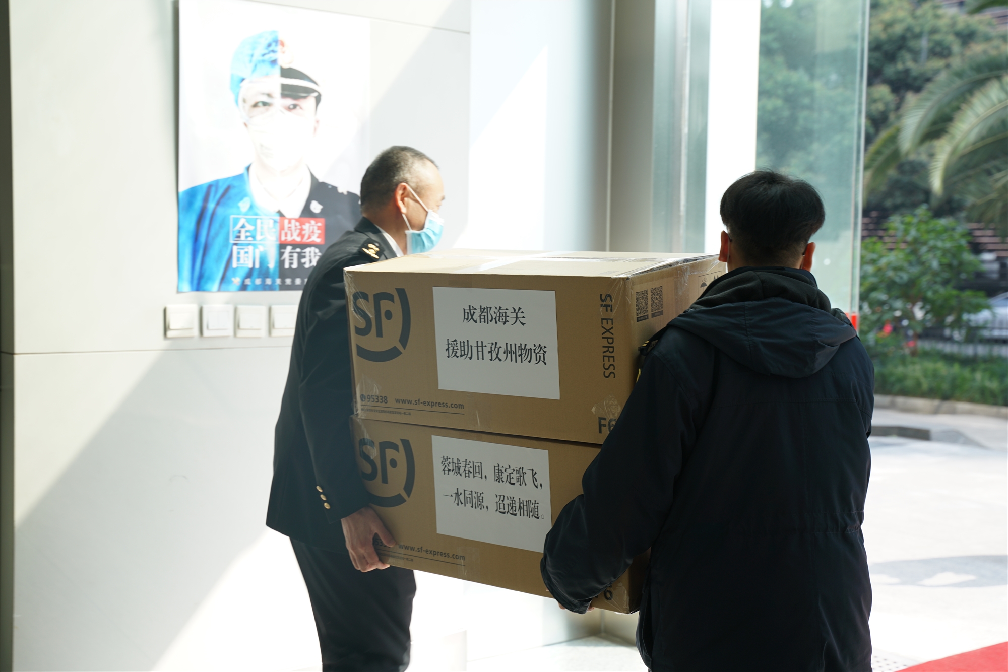蓉城春回,康定歌飛,一水同源,迢遞相隨。2月24日承載著成都海關(guān)滿滿情誼的防控物資發(fā)往甘孜州人民政府。2月25日,成都海關(guān)援助的疫情防控物資已送抵甘孜州,并立即投入到一線疫情防控工作中。