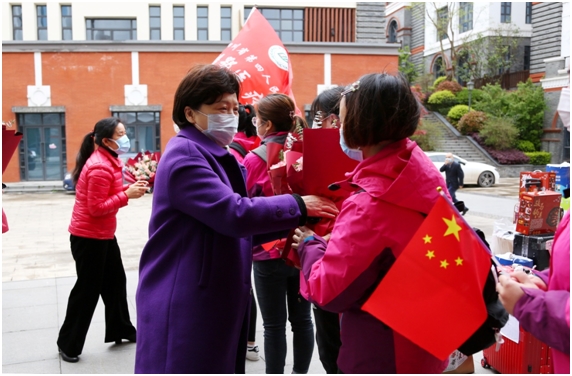 郭春英代表省機(jī)關(guān)事務(wù)管理局全體干部職工向援鄂醫(yī)療隊(duì)員送上鮮花,和大家親切握手交談,詳細(xì)詢問(wèn)隊(duì)員們工作和生活等情況。