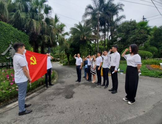 結(jié)束參觀,全體黨員在基地大門口面對鮮紅的黨旗,舉起右手,重溫入黨誓詞,莊嚴宣誓,并合唱《五星紅旗迎風飄揚》,進一步激勵大家不忘初心、牢記使命,繼往開來砥礪前行的思想意識。