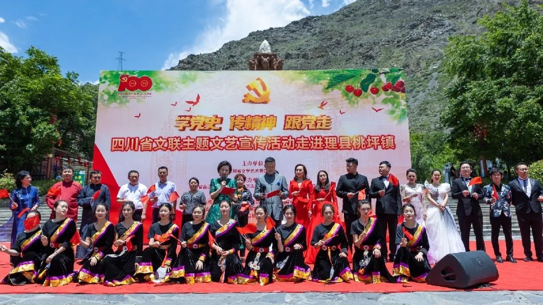 為慶祝中國共產(chǎn)黨成立100周年,貫徹落實中央和省委關(guān)于慶祝中國共產(chǎn)黨成立100周年和黨史學(xué)習(xí)教育的安排部署,結(jié)合開展“我為群眾辦實事”實踐活動,2021年6月5日,四川省文聯(lián)組織來自各省級文藝家協(xié)會的40余名文藝志愿者赴理縣桃坪鎮(zhèn),開展“學(xué)黨史 傳精神 跟黨走”主題文藝宣傳活動,用文藝的形式把黨的聲音帶到群眾身邊,在為群眾獻(xiàn)上一場精神文化大餐的同時宣傳推薦當(dāng)?shù)芈糜萎a(chǎn)業(yè)、農(nóng)林產(chǎn)品。