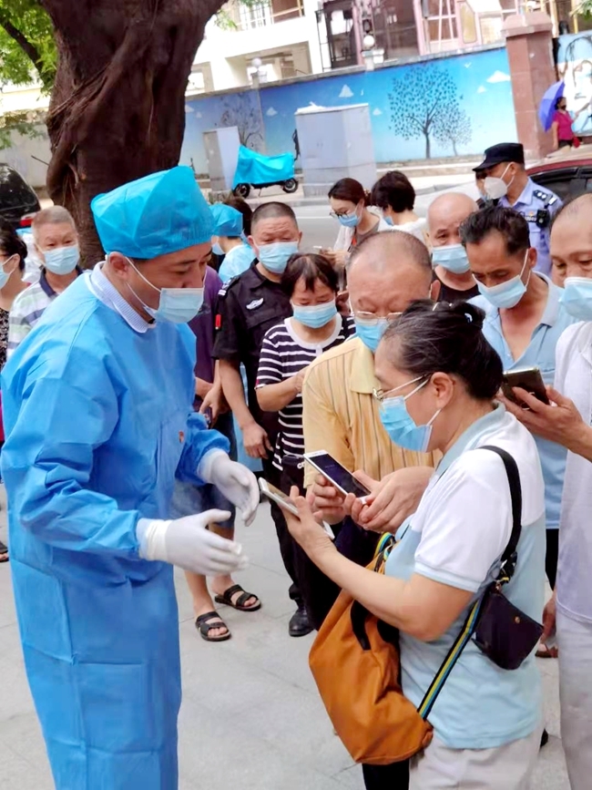 六月的廣州,驕陽似火,酷暑難耐,中共四川在穗單位委員會黨員突擊隊(duì)為社區(qū)服務(wù)的熱誠卻絲毫不亞于這炙熱的氣溫。黨員志愿者們穿上一身防護(hù)服,服務(wù)在核酸檢測點(diǎn)的第一線,從早上9點(diǎn)到晚上10點(diǎn),從烈日當(dāng)空到突然襲來的大雨,一站就是13個小時,協(xié)助維持秩序、指引有序進(jìn)場、安撫群眾緊張情緒、解答群眾疑問、做好核酸檢測注意事項(xiàng)的解釋說明、為行動不便的群眾推輪椅……更重要的是幫助檢測群眾掃碼登記信息。面對不會使用手機(jī)的老人家,黨員志愿者們手把手地協(xié)助掃碼、登記信息,一遍又一遍,不厭其煩。長時間的工作讓不少黨員志愿者喉嚨沙啞、衣服濕透,但他們依然堅(jiān)守現(xiàn)場,充分彰顯了黨員初心本色和忘我擔(dān)當(dāng)?shù)木瘛?/p>