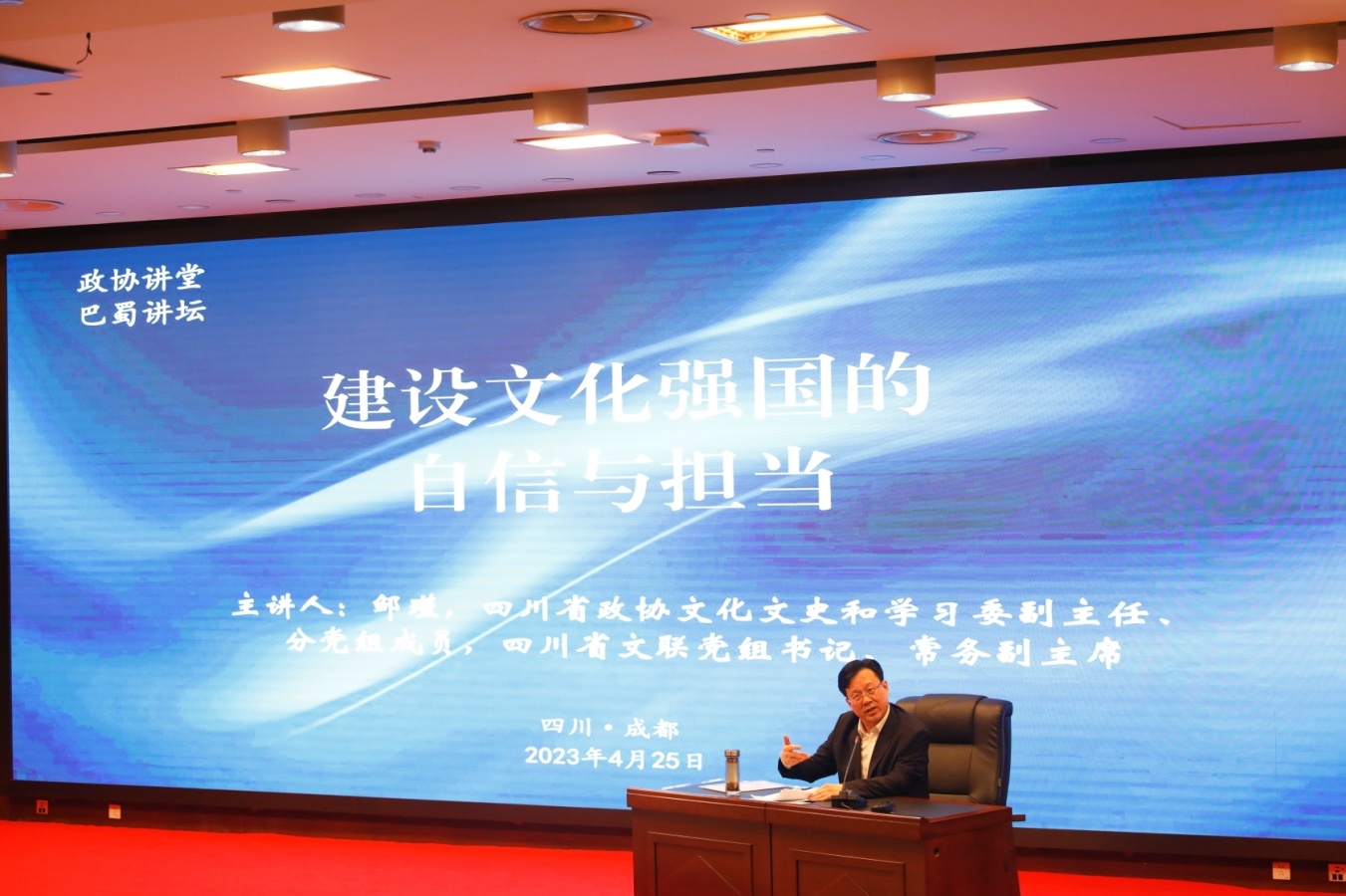 簽約儀式后,省政協(xié)委員、文化文史學(xué)習(xí)委副主任,省文聯(lián)黨組書記、常務(wù)副主席鄒瑾以“建設(shè)文化強(qiáng)國的自信與擔(dān)當(dāng)”為主題,圍繞文化強(qiáng)國的內(nèi)涵、我國在建設(shè)文化強(qiáng)國中的優(yōu)勢與短板、圖書館建設(shè)文化強(qiáng)國的途徑和擔(dān)當(dāng)?shù)确矫鏋榇蠹易鲗n}黨課輔導(dǎo),內(nèi)容詳實(shí)、深入淺出,現(xiàn)場反響熱烈。這也是省政協(xié)辦公廳與省圖書館共同打造“政協(xié)講堂”活動(dòng)的首次開講,講座視頻將在“四川政協(xié)同心書院”線上讀書平臺推送。