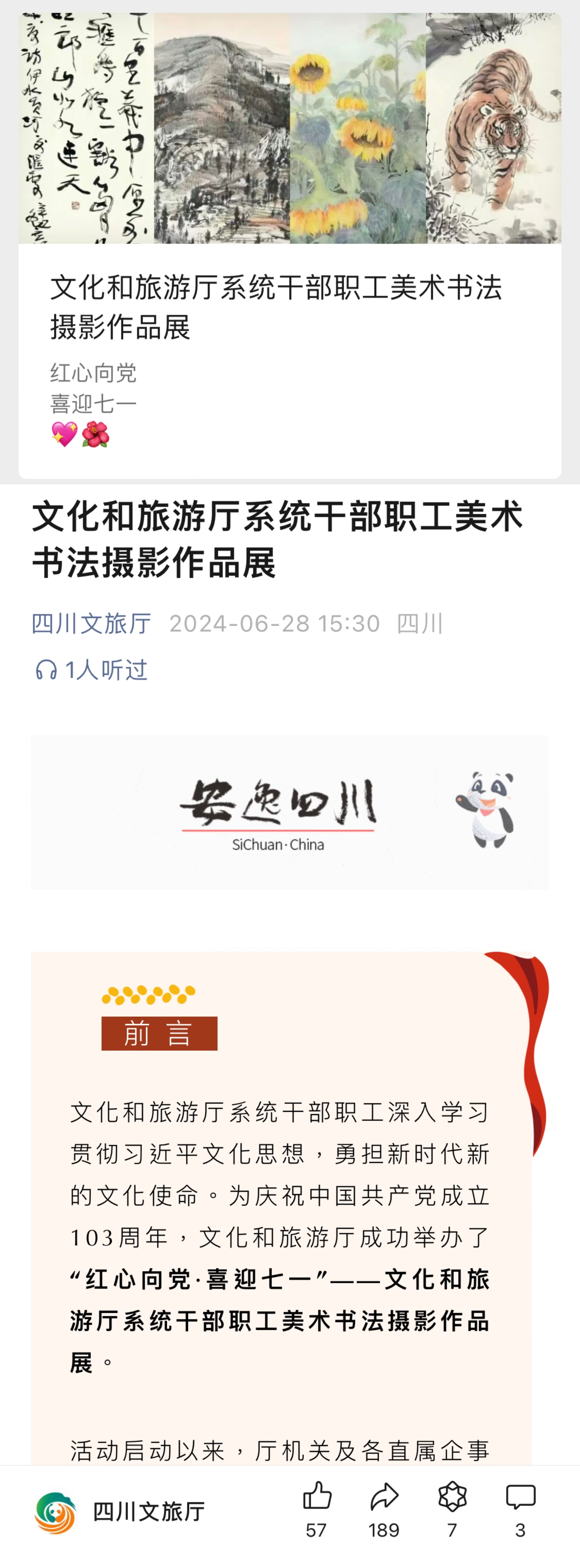 組織開展全廳系統(tǒng)“紅心向黨·喜迎七一”干部職工美術書法攝影作品展,通過專家評審、民主投票,評選出等級獎51件?;顒悠陂g選取部分優(yōu)秀作品分別在廳機關大樓和“智游天府”公眾號進行“線上+線下”展覽,受到各界廣泛關注,來自國內外的網(wǎng)友關注留言,各直屬單位公眾號、廣大干部職工紛紛轉發(fā),干部職工及退休領導到廳機關大樓與作品合影留念,為迎接建黨103周年營造良好氛圍。