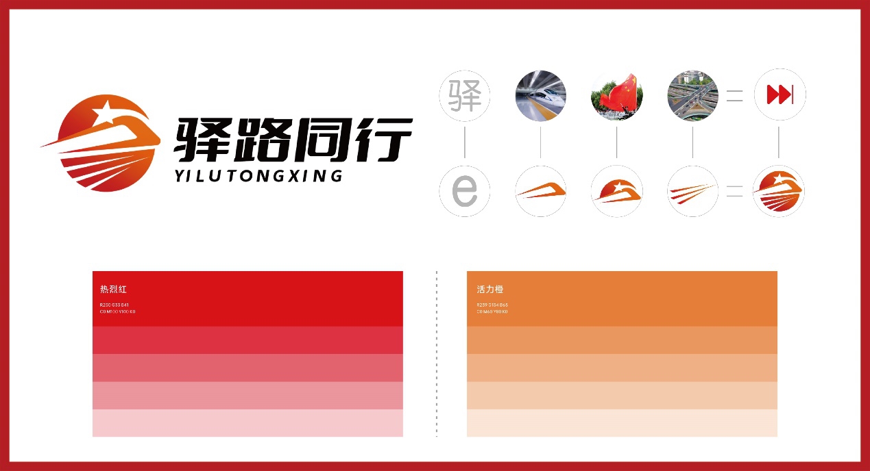 “驛路同行”標識形狀用同音字母“e”變形處理,取五角星、列車、道路等基礎元素構成。“五角星”位于列車上方,契合黨建引領火車站地區(qū)高質量發(fā)展主線;列車下方延伸的“道路”,象征著與多元力量一路同行的品牌理念。標識整體以紅橙為基礎色,表示品牌聯(lián)建成員單位一路同行的“紅心”與“活力”。