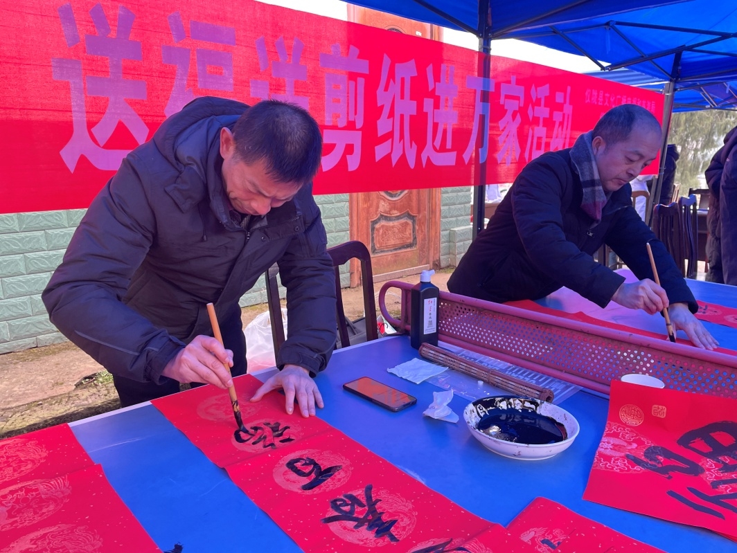 “寫春聯(lián)、剪窗花、送萬福”活動現(xiàn)場,來自儀隴縣文化館書法協(xié)會的書法家、市發(fā)改委書法愛好者揮毫潑墨,創(chuàng)作出一幅幅筆觸細膩、筆法精湛的春聯(lián)作品;剪紙大師們熟練自如地舞動著手中的剪刀,一張張栩栩如生的剪紙瞬間呈現(xiàn)眼前。工作人員第一時間把春聯(lián)和窗花送到村民手中,送上新年的美好祝福,現(xiàn)場熱鬧非凡。