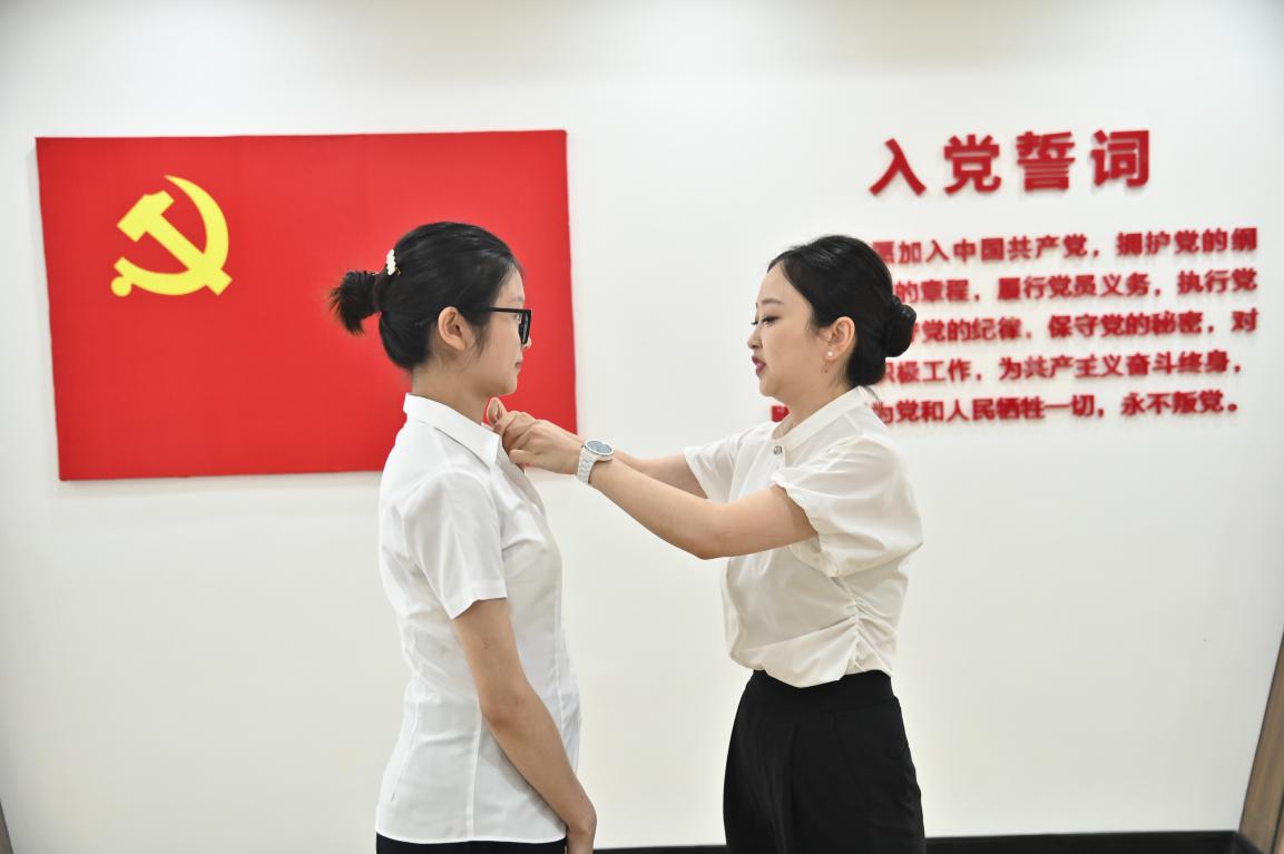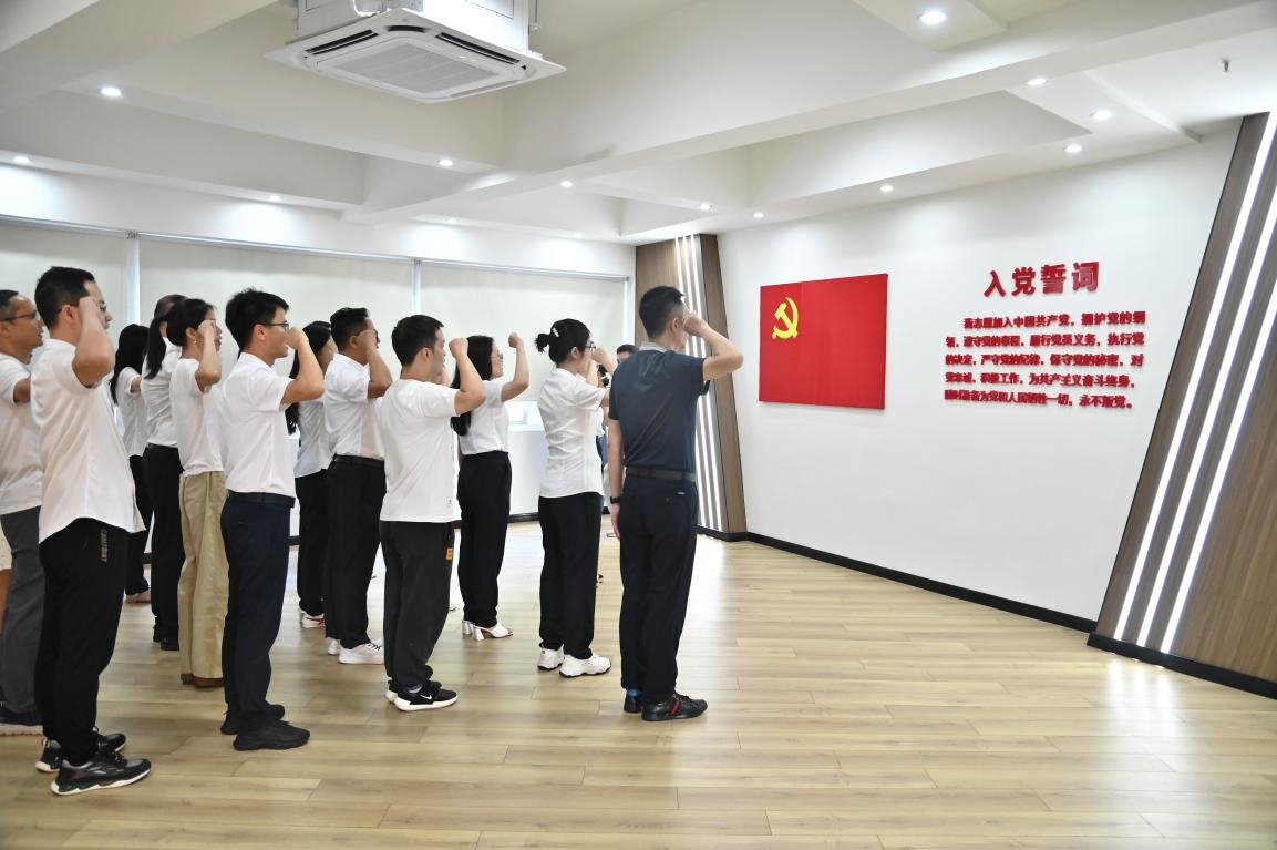 宣誓前,內(nèi)江日報社副社長、機關(guān)黨委書記黃亞平莊重地為新入黨黨員佩戴黨徽。胸前黨徽熠熠閃光,新入黨黨員們心中充滿力量。“我志愿加入中國共產(chǎn)黨, 擁護黨的綱領(lǐng),遵守黨的章程……” 宣誓環(huán)節(jié),黨員們面對鮮紅的黨旗莊嚴宣誓,一句句擲地有聲的誓言、一聲聲鏗鏘有力的話語,響徹黨員活動室,表達黨員們的堅定信仰。