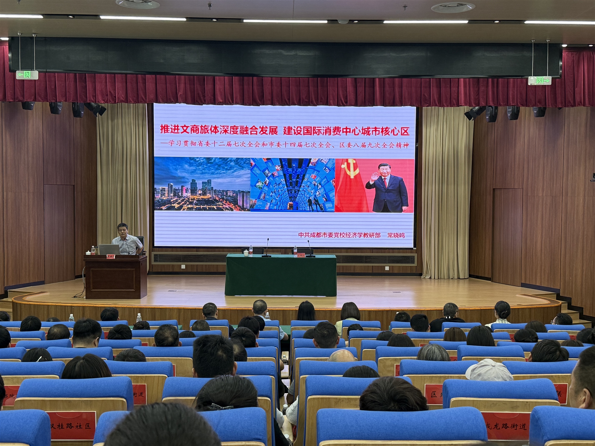 本次大講堂特邀中共成都市委黨校經(jīng)濟(jì)學(xué)教研部主任、成都市經(jīng)濟(jì)學(xué)會(huì)會(huì)長常曉鳴教授授課。常曉鳴教授以 “推進(jìn)文商旅體深度融合發(fā)展,建設(shè)國際消費(fèi)中心城市核心區(qū)” 為主題,圍繞做大做強(qiáng)全省文化旅游業(yè)、加快建設(shè)世界文化旅游名城、大力發(fā)展首發(fā)經(jīng)濟(jì)等主線,結(jié)合春熙路商圈首發(fā)經(jīng)濟(jì)實(shí)踐、寬窄巷子文旅升級(jí)等成都本地鮮活案例,用通俗易懂的語言拆解政策要點(diǎn),具象化解讀省市區(qū)三級(jí)全會(huì)精神,為參會(huì)人員理解全會(huì)部署、把握發(fā)展方向提供清晰視角與深度思考,帶來一場(chǎng)干貨滿滿的專題輔導(dǎo)。