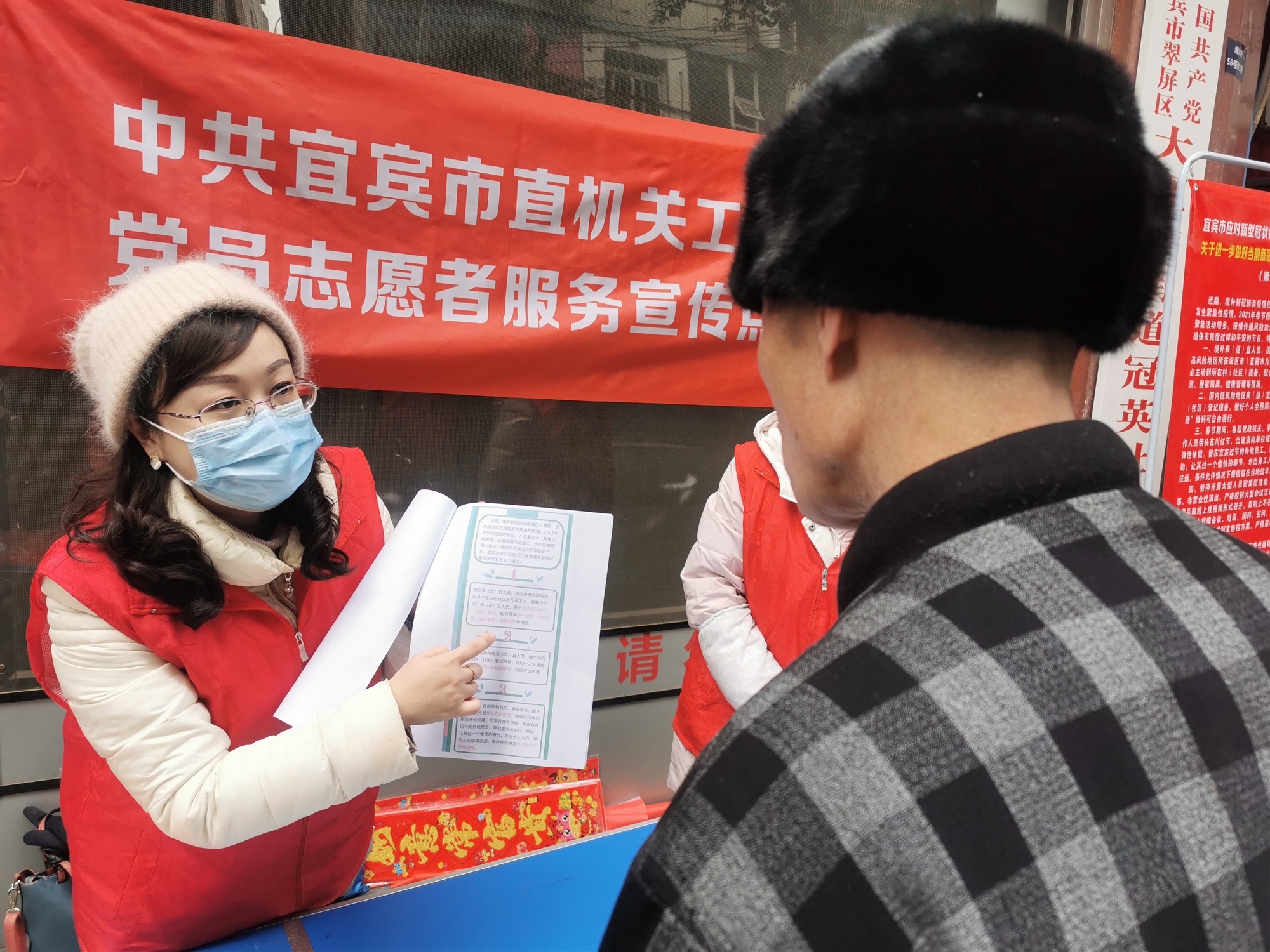 在冠英社區(qū),市直機關(guān)工委黨員志愿者設(shè)置志愿服務(wù)宣傳點,開展疫情防控、《宜賓市文明行為促進條例》、森林防火、《未成年人保護法》、社會主義核心價值觀等知識宣傳,并發(fā)放相關(guān)宣傳資料。針對春節(jié)返鄉(xiāng)人員大幅度增多的情況,黨員志愿者們認真開展健康提醒、疫情防控指導(dǎo)、法治知識宣傳,宣傳科學文明理念和健康生活方式,引導(dǎo)群眾加強自我防護意識。