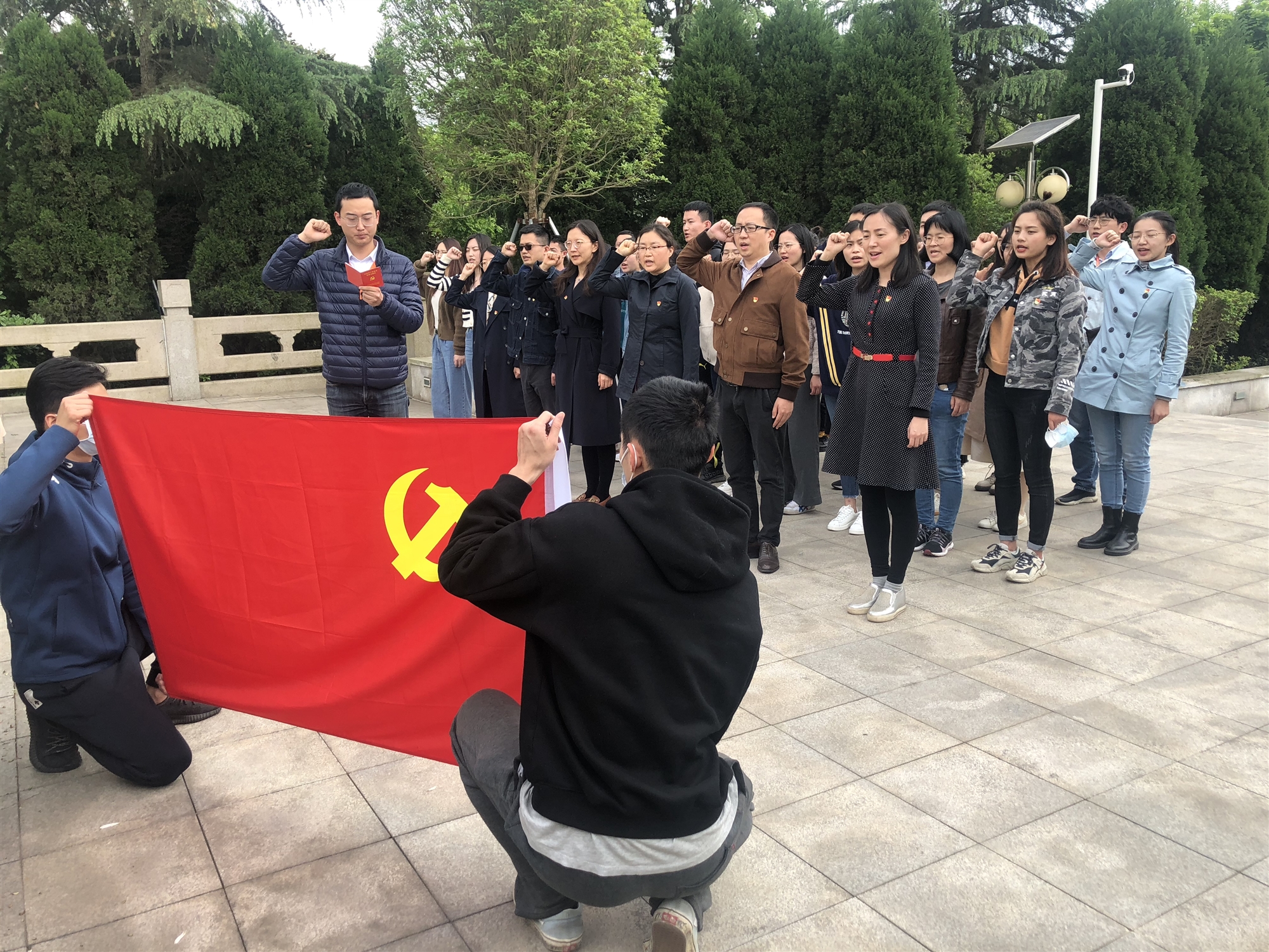 在革命烈士紀念碑前,大家懷崇敬之心,鞠躬默哀,敬獻鮮花,吊唁先烈,寄托哀思。隨后,黨員們高舉右拳,迎著鮮紅的黨旗,重溫入黨誓詞。